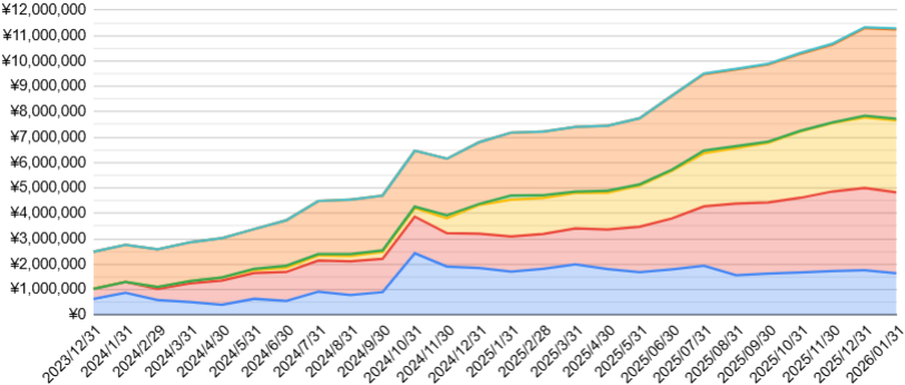わが家では生活防衛資金を確保した上で、余剰資金の約半分をインデックス投資(S&P500)に充てています。今月は株主優待や配当目的で保有していた日本の個別株が相場の影響により約10万円のマイナスとなったため、前月比マイナスとなりました。1,000万円を超えてからも、やることは変わらず「仕組み」を回し続けるのみです。
